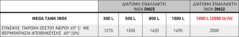 Τα δοχεία MEGA TANK INOX 300-500-800-1000-1000(2500lt/h) ζεστού νερού χρήσης είναι ειδικά σχεδιασμένα για την αδιάλειπτη παροχή Ζ.Ν.Χ σε ξενοδοχειακές μονάδες κάθε κλίμακας. Τα πρωτοποριακά δοχεία MEGA TANK-INOX διαθέτουν ειδική ανοξείδωτη σερπαντίνα για την άμεση παραγωγή Ζ.Ν.Χ. με την τεχνολογία «φρέσκου νερού». Το ζεστό νερό χρήσης διέρχεται μέσα από την ανοξείδωτη σερπαντίνα και θερμαίνεται άμεσα, χωρίς να έρχεται σε επαφή με το αποθηκευμένο θερμό νερό του δοχείου, διασφαλίζοντας με τον τρόπο αυτό, απόλυτα τρεχούμενο και καθαρό ζεστό νερό. Η ανάγκη για απολύμανση του δοχείου (αντιλεγιονέλλα) μηδενίζεται, καθώς το νερό που θα καταλήξει στις παροχές είναι διαρκώς ανακτούμενο. Η μεγάλη επιφάνεια εναλλαγής καθώς και η μεγάλη διάμετρος της (DN 25 ή DN 32) διασφαλίζουν την υψηλή απόδοση του συστήματος σε παροχές που φθάνουν μέχρι και τα 2500 lt/h. Ένα MEGA TANK-INOX 1000 προσφέρει 2500lt/h Ζεστού Νερού Χρήσης σε αιχμή ζήτησης 1,5 ώρας και άνω με ομοιόμορφη κατανομή και διάρκεια του κάθε ντους 20 λεπτά*. Τα δοχεία MEGA TANK-INOX 1000 είναι ιδανικά για θέρμανση χώρου και λόγω των πολλών παροχών που διαθέτει μπορεί ταυτόχρονα να συνδεθεί με αντλία θερμότητας χαμηλών–υψηλών θερμοκρασιών, λέβητα αερίου-πετρελαίου-pellet, ηλιακούς συλλέκτες ή άλλες ανανεώσιμες πηγές ενέργειας και να προσφέρει ταυτόχρονα θέρμανση χώρου και ζεστό νερό χρήσης μέσω του μεγάλου ανοξείδωτου εναλλάκτη DN25 / DN32.